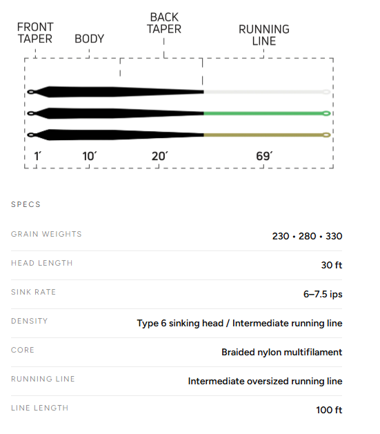 A 30 ft Type 6 sinking head gets heavy flies into the strike zone fast, with an intermediate running line to keep you connected.