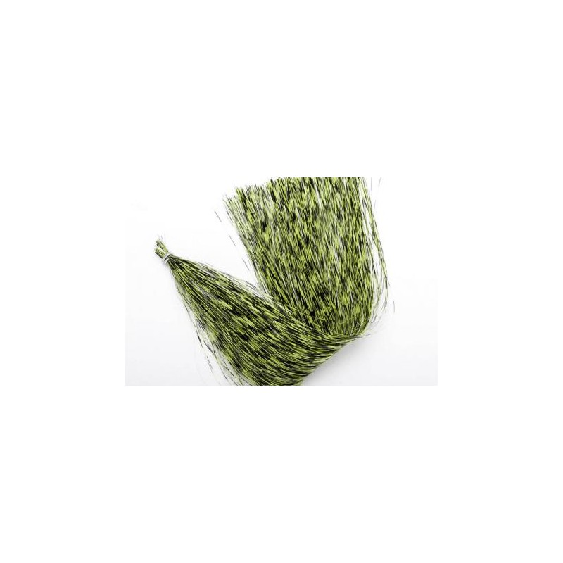 Transparent colors with a black bar. An excellent synthetic alternative for the expensive grizzly feather. Contains approximately 1,250 strands, 1/69” wide by 10” long.