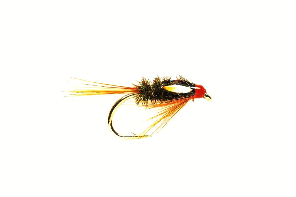 A best seller.This variation is tied with jungle cock cheeks and a red hot head as well as a red holographic rib over the peacock herl body, a generic nymph pattern that imitates a broad range of natural food