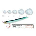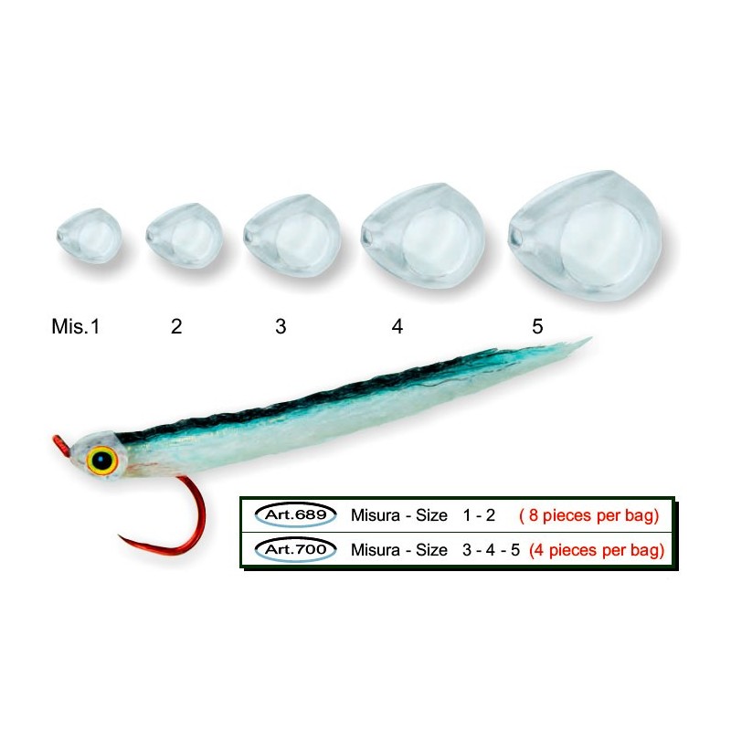 These small heads produced in five different sizes are identical in shape and dimensions to “Streamer fish heads” but they have the particularity of being made of a clear and elastic material. The elasticity of the material allow to insert big hooks (1/0 – 2/0) with large diameter hook eyes. Ideal for sea fishing imitations like silversides, sardines, etc.