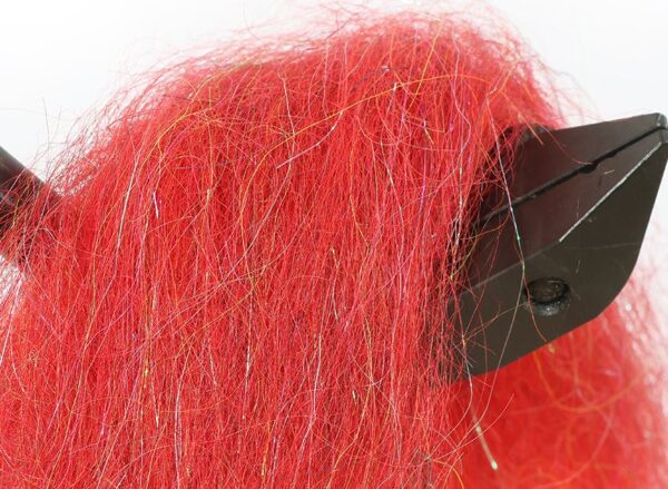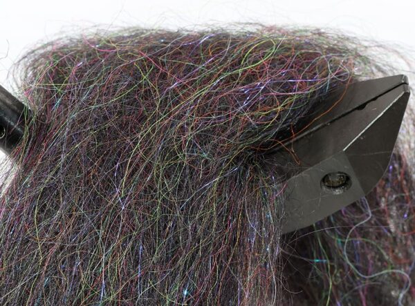 This unique dubbing with up to 120 mm long threads is designed for tying pike streamers and saltwater flies. It consists of fine crimped round fibers that are dyed, dyed flat crimped fibers and flat crimped flash fibers that imitate small fish scales. Each color consists of many shades and usually about 1/4 of the fibers reflect UV light. The overall impression is therefore excellent. A generous pack of 2 grams!