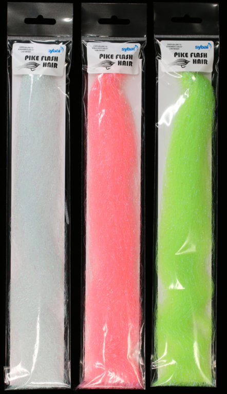Sybai Pike Flash Hair is synthetic hair material for large streamers, pike flies and saltwater flies. Fibers are quite soft, curly and they give volume to streamer at low weight. There is also some flash fibers added. As the material is synthetic, it doesn’t absorb water as much as natural equivalents. Fibers are over 30 cm long.