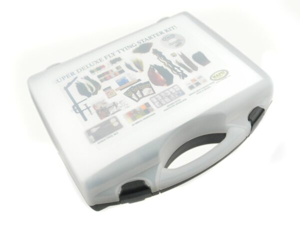 Our Super Deluxe Fly Tying Starter Kit is an expanded version of our Deluxe Kit including an upgraded vise, boxed tool kit, fully loaded dubbing dispenser, loaded magnetick hook box, and 6-compartment box loaded with an assortment of eyes and beads. All of this is packaged into a handy plastic carrying case with Handbook