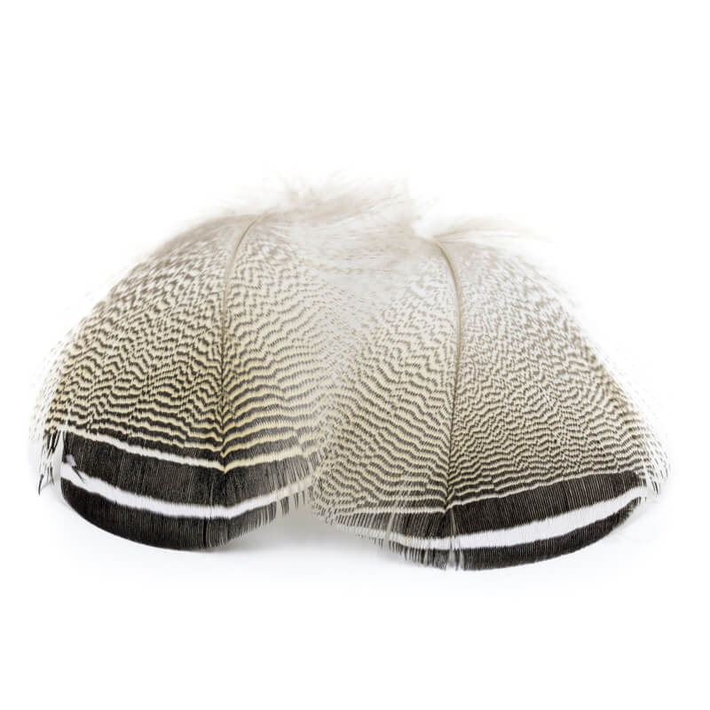 A must for many popular salmon fly patterns is Black and White Wood Duck. These finely barred, lemon yellow flank feathers have alternating bands of black and white on their tips. Three lefts and three rights per package.