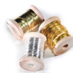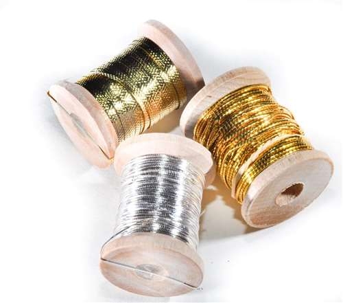Embossed Tinsel: Gold or Silver flat tinsel with small textured pin points. A traditional material.