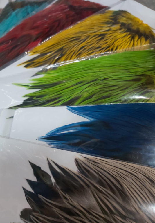 The Brahma Rooster Saddle from Whiting Farms, the original PURE Brahma was and still is the very best Silver Badger hackle natural or dyed for Salmon & Seat Trout Flies. None of the cross breeding to create bigger pelts just the pure brahma the way nature created this fine rooster that produces the cleanest silver badger hackles possible for dying in very true colours!!! THIS is the VERY BEST Silver Badger dyed for Salmon flies in the 14-12-10 size range with a few either side!!! Just look at those images you can see how good they are!!!