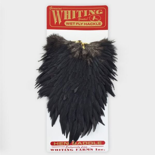 Whiting hen saddles have firm, resilient barbs with high barb density on a fine yet strong quill. The webby feathers are great for legs and collars on bluegill, wet flies and nymphs with hook sizes in the 12 to 16 range. The feathers can also be burnt or cut for upright dry fly wings. Other uses include legs and wings on hoppers and other terrestrials, and tails and hackle on small bass bugs. The overall length of the saddle is about 9 inches.